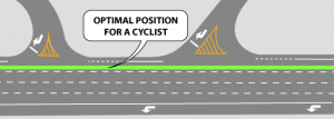 In the referenced article from where these drawings came from help illustrate the necessity to be in the main traffic flow or at least immediately adjacent to the main traffic flow. There is a flaw in MD law rather then allowing cyclists leaving the right where right turns are authorized, MD limits it to only right turn ONLY lanes.