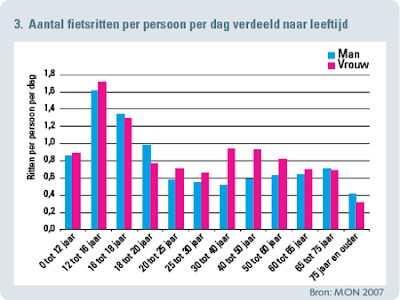 It shows a number of things: that cycling is very popular with school age children, for instance, and that it drops off a bit for working age adults as for some the commute is “too far” by bike. You’ll also see that women in their 30s, 40s and 50s cycle more often than men. This is due to women being more likely to be at home looking after children than their male partners. As a result, they more often cycle with young children to school, or make shopping and other utility trips by bike. This is what leads to the Netherlands uniquely having 55% of trips overall by women.