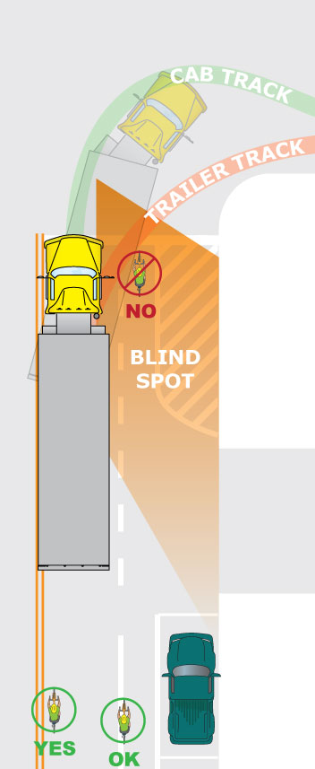 Trucks make wide turns. They cannot physically make a right turn from the right curb, so they will often leave a large, inviting opening on their right prior to a turn. They will also move straight into the intersection before starting to turn. When a truck turns right across your path, it is almost impossible to escape its rear wheels. So don’t get caught in a spot where this can happen! Be aware of what kind of situation can lead to a potential crash and avoid it.