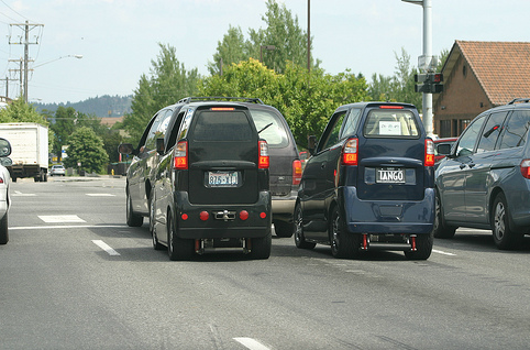 If I want to hang with a friend — all other things being equal — if I can’t talk to them while we’re moving about, I’m driving. That decision is simple. I want to be able to talk to my friends while we’re riding our bikes around. Cars do not deserve two to three times the asphalt just because they’re wider. If people are really dedicated to getting around by individual private motorized transport, they can go buy a Tango ‘single-file’ car: