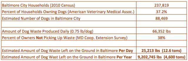 In short, research is showing that this is a significant part of urban pollution. The chart below shows the estimated amount of waste being left on the ground by dog owners in the city of Baltimore alone: