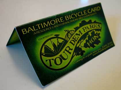 Avid cyclists and aspiring city bike riders are recommended to keep their eyes peeled for this handy little green wallet card containing a wealth of information about bicycling in Baltimore. The card has been distributed to area businesses and organizations.