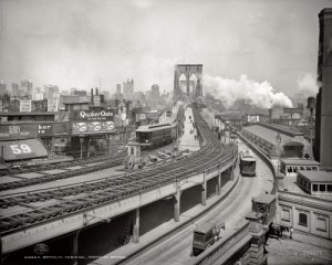 In the headlines this morning, we linked to a great historical photo of the approach to the Brooklyn Bridge on Brownstoner, and it’s taking a closer look at the full implications of the shot. Not for nostalgia’s sake, but to make a cool, calculated appraisal of the efficiency of this piece of transportation infrastructure, as currently configured.