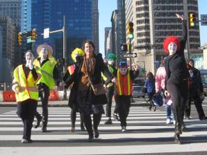 This morning 7 clowns stood guard at the corner of 15th and JFK. The clowns were on a mission: to make sure that Philadelphia drivers, pedestrians and bicyclists obeyed traffic laws. The clowns specifically targeted distracted drivers and walkers; drivers not wearing their seat belts; drivers and bicyclists impeding crosswalks; bicyclists on the sidewalk; pedestrians crossing against the light and pedestrians failing to obey no crossing signs at Dilworth Plaza construction site.